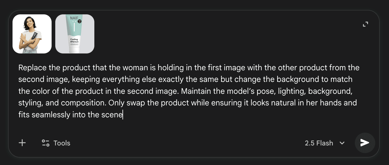 Now comes the fun part. Switching out the fake product with the real one. How to do this? We use one of the tools we used in the past: Nano Banana.