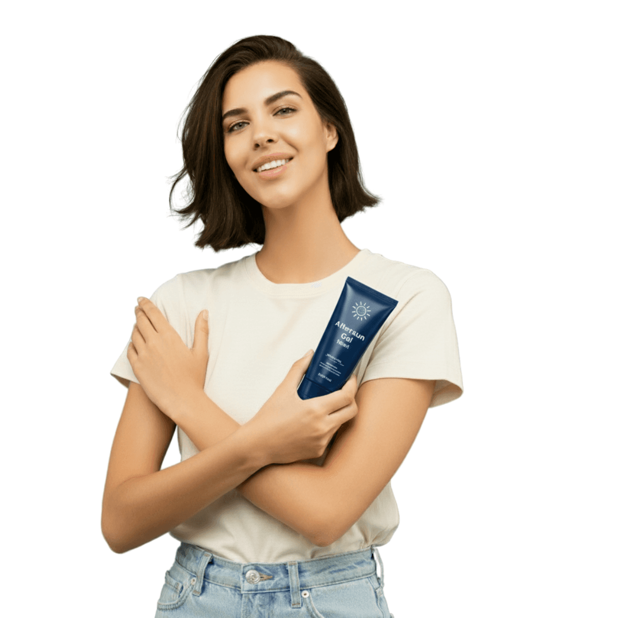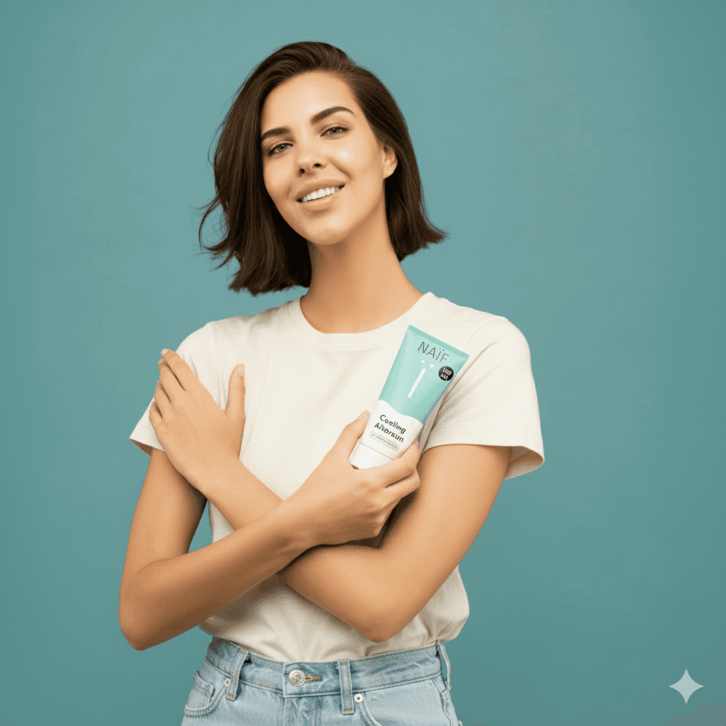 “A professional photoshoot of a woman holding a 100ml Cooling Aftersun Gel. She holds the product naturally in her hands, angled to display the label clearly. The lighting highlights her skin and the gel’s texture, with a clean, minimal background that emphasises the product. Capture a fresh, summery, and soothing atmosphere, with sharp focus on the gel and soft, flattering light on the model. Include professional styling, natural makeup, and relaxed yet confident posture”.