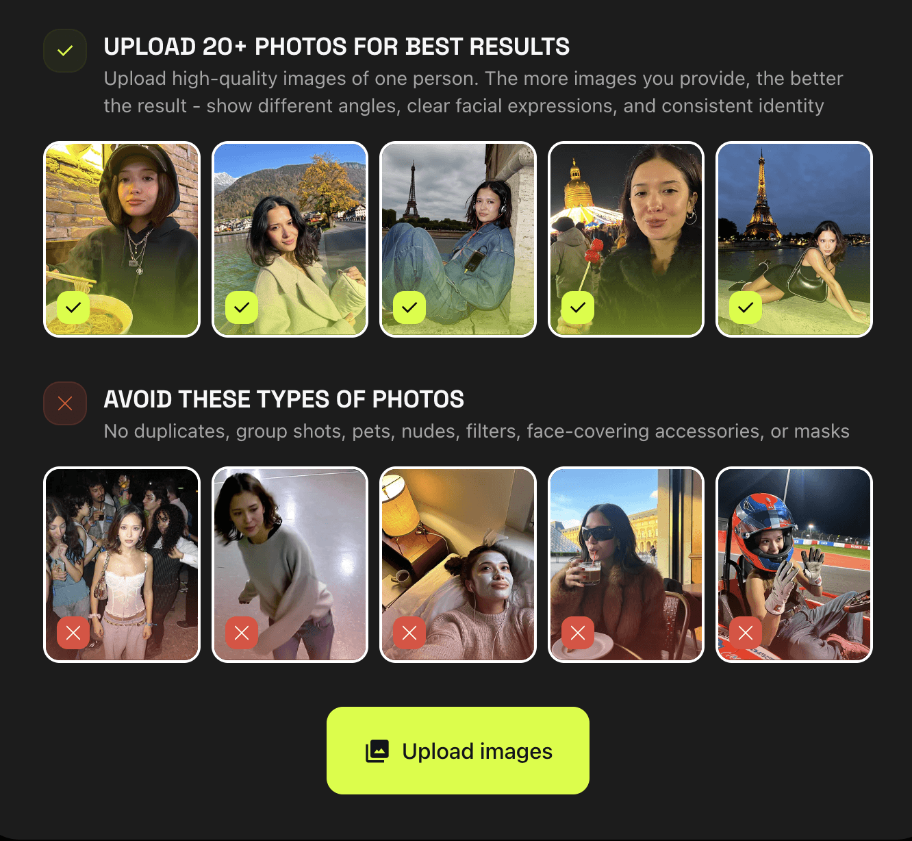 To build an AI character with Higgsfield, you need to upload between 5 and 70 photos. The more realistic you want the character to be, the more high quality photos of a person you need to upload.
