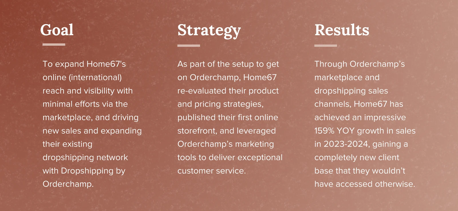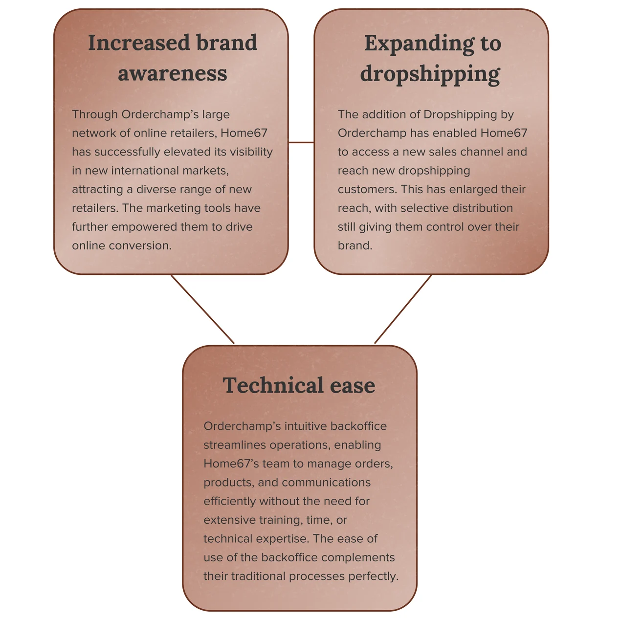 The partnership illustrates how manual and digital processes can work together seamlessly. By selling on Orderchamp’s marketplace of 150,000+ verified retailers, Home67 were able to expand their reach and gain access to an entirely new customer base, leading to a significant increase in sales. Furthermore, thanks to Orderchamp’s suite of sales channels, Home67 was able to start dropshipping in no time, giving their customers more ways to buy their products. This collaboration has allowed Home67 to expand their B2B business without requiring significant time or resources, giving them the freedom to focus on what matters most—driving their business forward.