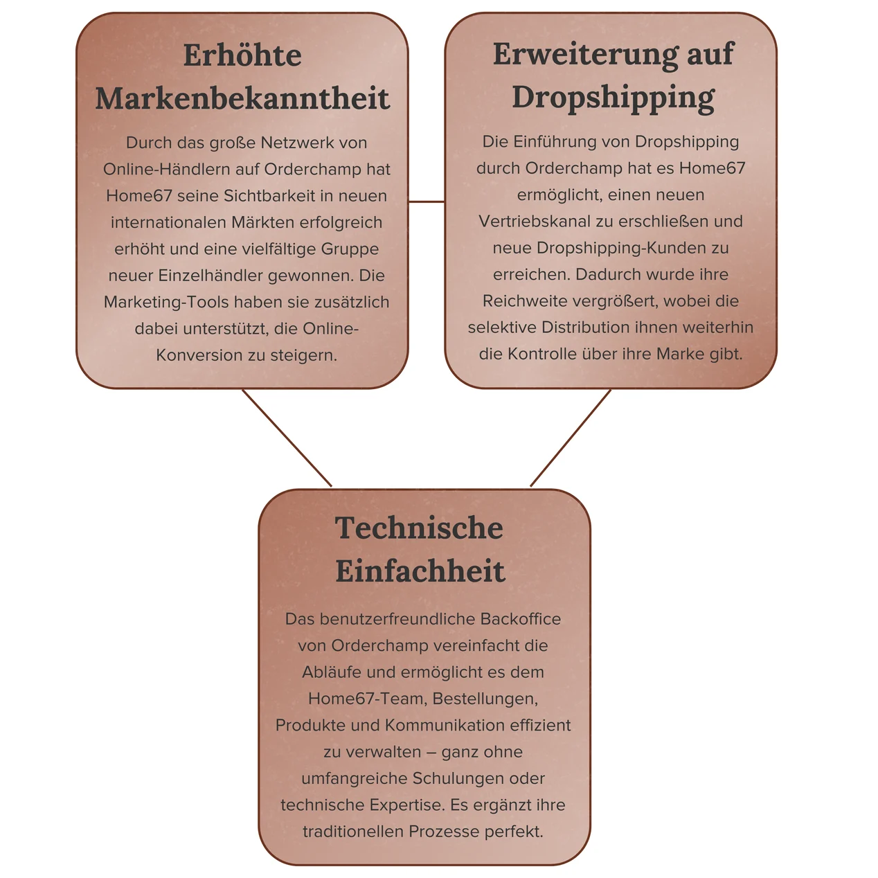 Nachdem Dropshipping by Orderchamp verfügbar wurde, war es für Home67 der nächste logische Schritt, diesen Vertriebskanal in ihre Strategie zu integrieren. Da sie bereits über den Marktplatz verkauften, konnten die meisten Produkte und Einstellungen übertragen werden, sodass sie innerhalb eines Tages einsatzbereit waren.