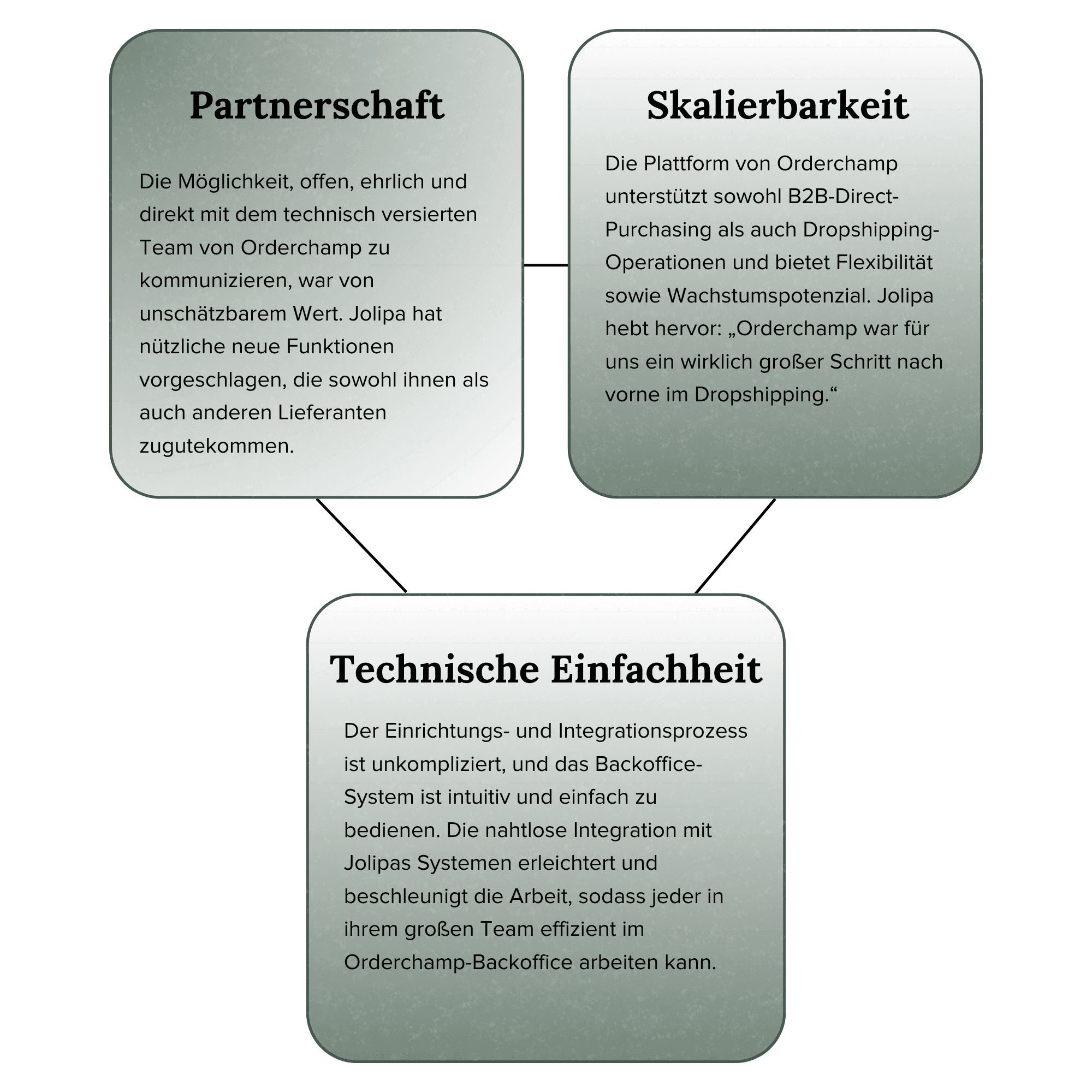 Die Zusammenarbeit zwischen Orderchamp und Jolipa zeigt die Kraft der Partnerschaft: eine Beziehung, in der beide Parteien profitieren, voneinander lernen und sich kontinuierlich verbessern, um eine Win-Win-Situation zu schaffen. Jolipa half Orderchamp, das Backoffice durch Vorschläge für zusätzliche Tools zur Verwaltung ihres Produktkatalogs, wie verbesserte Filter- und Bulk-Bearbeitungsoptionen, zu verbessern. In der Zwischenzeit konzentrierte sich Orderchamp auf die vollständige Automatisierung des Verkaufsprozesses, wodurch die Kanäle von Orderchamp schnell und effizient wurden. Letztendlich haben die gemeinsamen Anstrengungen beider Parteien Jolipa zum Erfolg auf dem Marktplatz und im Dropshipping von Orderchamp verholfen.