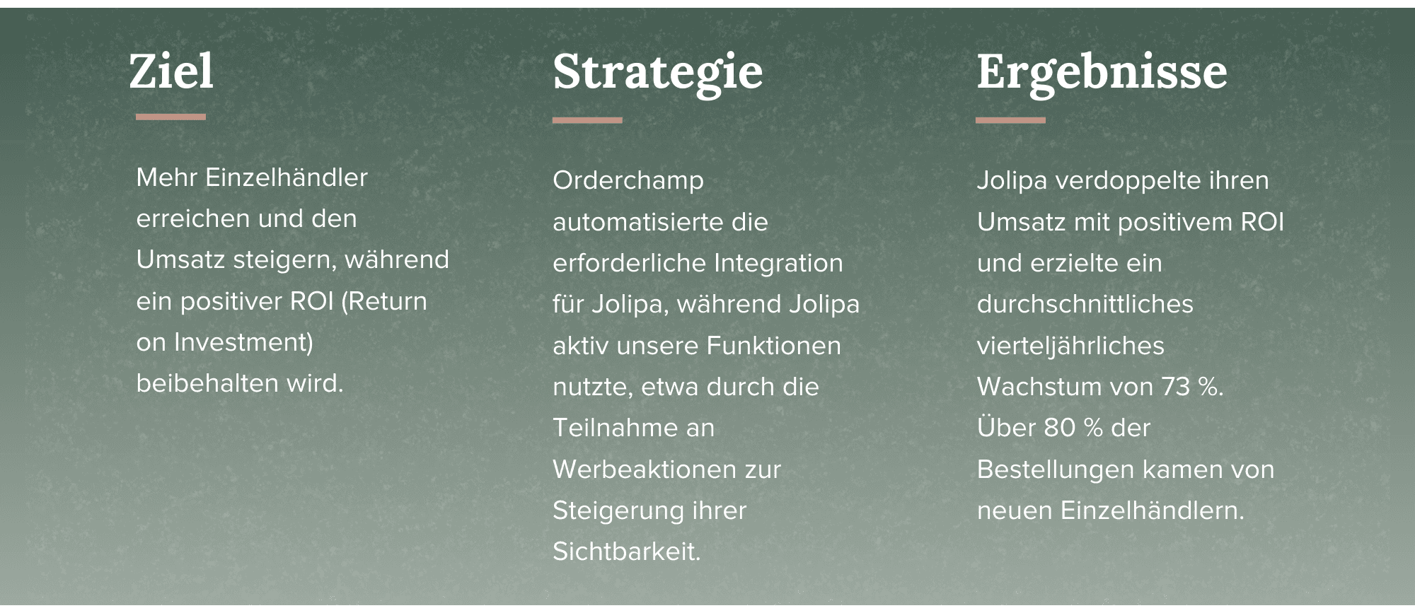Dank der gemeinsamen Anstrengungen von Jolipa und Orderchamp hat Jolipa nun über 80 % neue Käuferhändler und wächst Monat für Monat weiter, mit Umsatzsteigerungen von 55-180 % bei Teilnahme an Orderchamp-Werbeaktionen. Weitere Highlights der Zusammenarbeit sind laut Jolipa:
