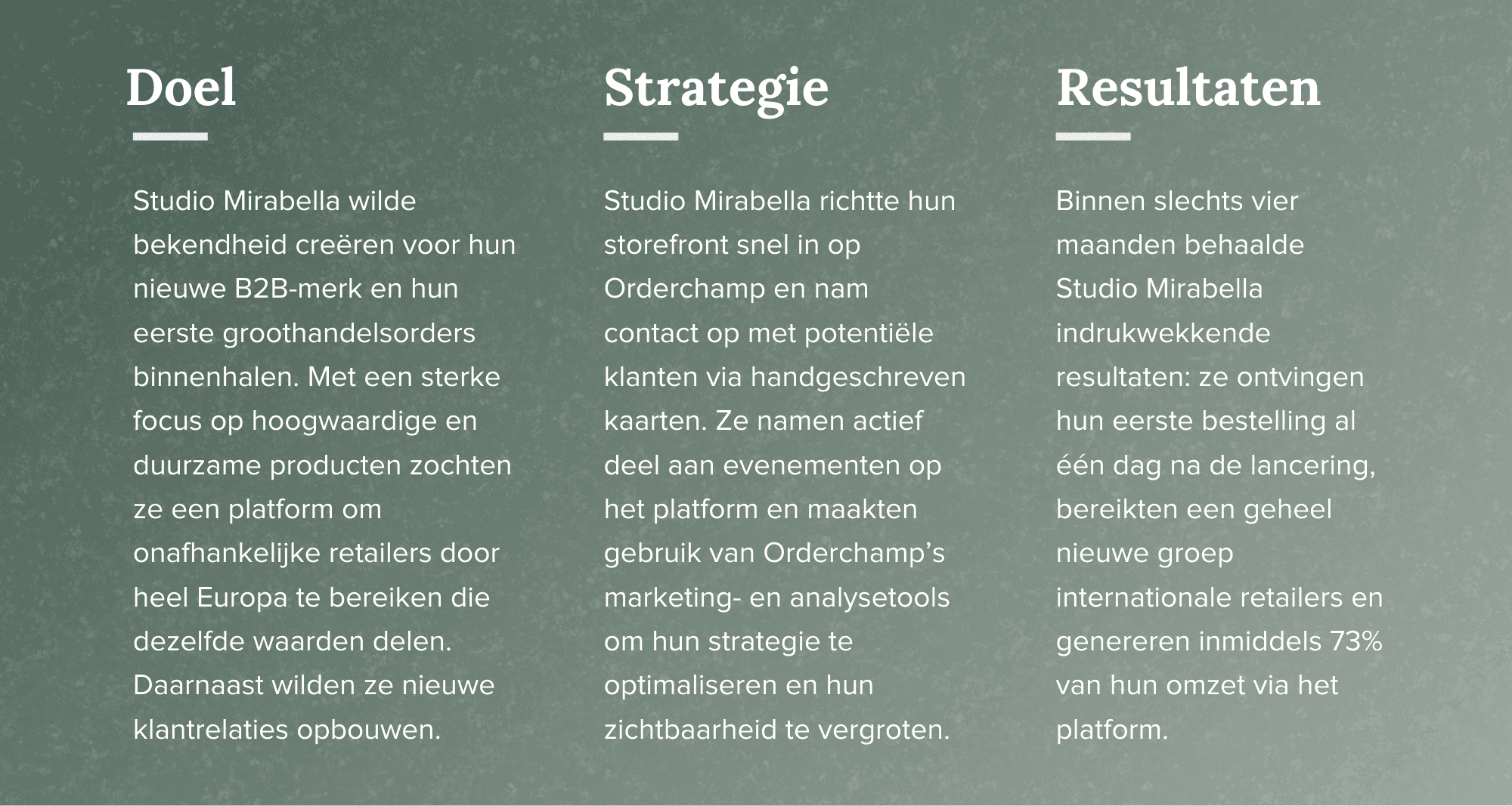 Voordat Studio Mirabella zich als merk op het Orderchamp-platform registreerde, waren ze al actief als inkoper op het platform. Ze waren onder de indruk van de gebruiksvriendelijke interface, het gemak waarmee producten gevonden konden worden en de goed georganiseerde inkoopcampagnes. Deze positieve ervaringen overtuigden hen ervan dat Orderchamp het ideale platform was om hun producten te presenteren en in contact te komen met nieuwe klanten.
